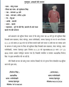 रानीपोखरी:- देहरादून जनपद के थाना रानीपोखरी क्षेत्र के ग्राम रखवाल, पोस्ट ऑफिस भोगपुर निवासी 16 वर्षीय सोनू रावत पुत्र सूर्यपाल सिंह बीते शनिवार सुबह से लापता हैं। परिवार के अनुसार, सोनू 9 नवंबर की सुबह करीब सात बजे बिना बताए घर से कहीं निकल गया, और उसके बाद से अब तक घर नहीं लौटा है। लड़के के परिजनों ने थाना रानीपोखरी में गुमशुदगी की रिपोर्ट दर्ज कराई है। पुलिस ने इस पर मुकदमा संख्या 95/25, धारा 137(2) BNS बनाम अज्ञात दर्ज किया है। मामले की जांच उप निरीक्षक विजेन्द्र सिंह को सौंपी गई है।