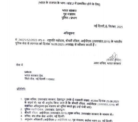(अरुणाभ रतूड़ी जनस्वर) आईपीएस अधिकारी रचिता जुयाल का इस्तीफा स्वीकार, 16 सितंबर से सेवा मुक्त। नई दिल्ली। केंद्र सरकार ने