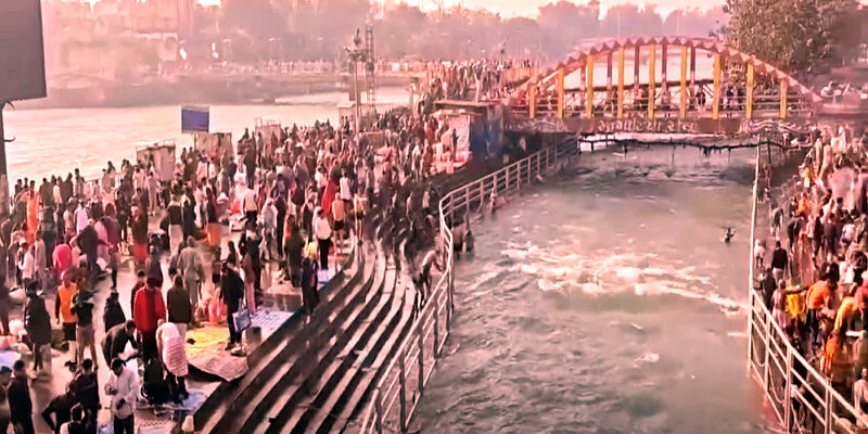 हर की पैड़ी का विहंगम दृश्य:-हर की पैड़ी का दृश्य आज अद्भुत है। जहाँ तक नज़र जा रही है, केवल श्रद्धालुओं के सिर ही दिखाई दे रहे हैं। ड्रोन कैमरों से ली गई तस्वीरें एक विहंगम दृश्य प्रस्तुत कर रही हैं—गंगा के घाटों पर उमड़ी भीड़ किसी विशाल मानव समुद्र जैसी लग