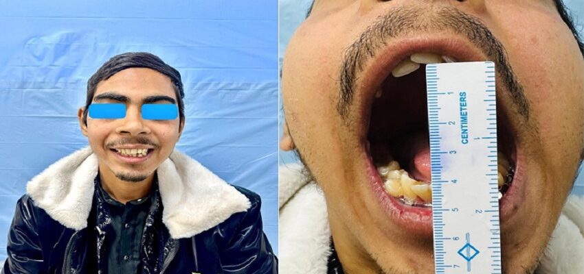 मरीज का मुंह बिल्कुल नहीं खुल रहा था। निचला जबड़ा लगभग 2 सेमी पीछे था, रैमस की ऊंचाई में 2 सेमी का अंतर था, ठोड़ी 12 मिमी बाईं ओर झुकी हुई थी, होंठ का बायां कोना 1 सेमी ऊपर उठा हुआ था तथा सामने के दांत 1 सेंटीमीटर नीचे थे । सामाजिक और मानसिक रूप से भी वह प्रभावित था।